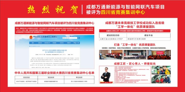 根据四川省人力资源和社会保障厅《关于开展中华人民共和国第三届职业技能大赛四川省竞赛集训中心遴选工作的通知》(川人社办发〔2024〕60号)安排,经项目申报、初审推荐、条件复审、专家评分和综合评议,成都万通新能源与智能网联汽车项目成功获评为四川省竞赛集训中心。