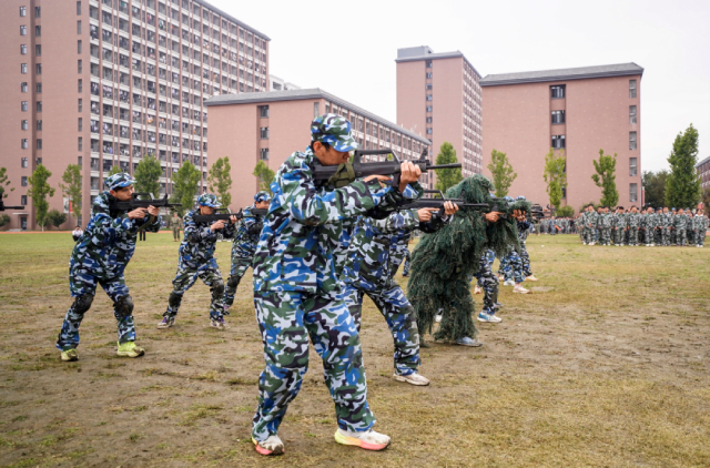随后的军事科目汇报表演更是精彩纷呈。男子军体拳方队动作刚劲有力,喊声气冲霄汉,尽显阳刚之气;女子队列展示方队则用柔美而坚定的手势,演绎了《强军战歌》的别样风采,体现了新时代青年的柔情与担当。战术演练等模拟项目,同学们行动迅速、配合默契,将现场气氛推向高潮,充分展示了新生们过硬的军事素养和团队协作精神。
