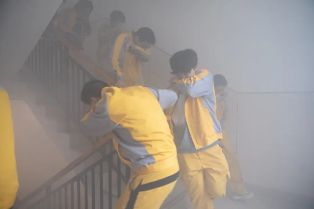 在各楼层疏导员的指引下,全体师生员工反应迅速,严格按照应急预案规定,用湿毛巾捂住口鼻,弯腰低姿,沿着预定的疏散路线,快速、有序地从各个安全出口撤离至指定的应急集合点。整个疏散过程紧张而不慌乱,仅用时3分15秒,所有人员便全部安全撤离完毕,达到了预期效果。