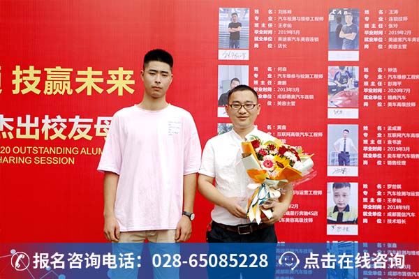 唐蕾, 21岁,今年6月毕业于万通汽车检测与维修工程师专业,目前任职于成都跃腾汽车维修技术有限公司,担任汽车机电维修组组长一职,年薪10万+。