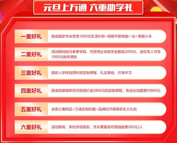 成都万通专业课程全新升级,教学设备加强,专业技术更新,教学内容更全,新推汽车智能检测与维修工程师、轨道交通与汽车商务运营等热门专业,活动期间报名还可享最高2000元元旦专属助学金。