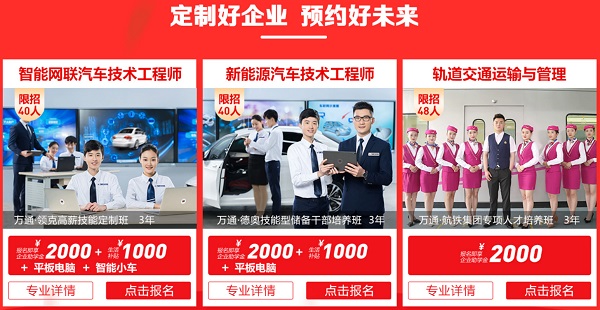 活动期间报名智能网联汽车技术工程师、新能源汽车技术工程师、轨道交通运输与管理等校企定制班即可现场签订就业协议,学习期间企业实地参观,获得管理核心课程,还可申请企业助学基金、贫困减免金、定制班优生奖学金等助学政策。让你来万通无忧学技术,满意入职场!