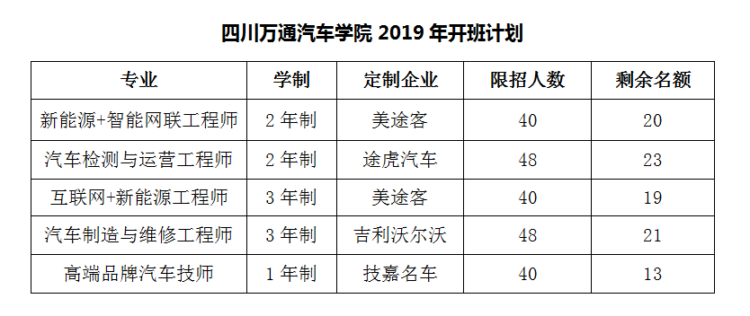 报名火!入学火!四川万通汽车学院2019年春季报名火火火!来自五湖四海的学子纷纷奔赴四川万通报名开启美好人生。新春开学礼,来校参观报销路费领技术红包,还有名企定制班名额及企业助学金,名额有限,报满即止,请同学们抓紧抢报!